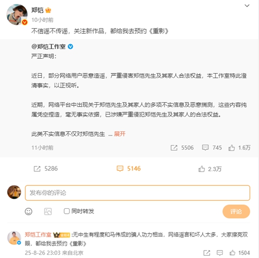 郑恺转发了工作室声明,并配文:“不信谣不传谣,关注新作品,都给我去预约《重影》”。这一举动间接表明了自己的立场,既表达了对谣言的不屑,又巧妙地宣传了自己的新作品,可谓一举两得。